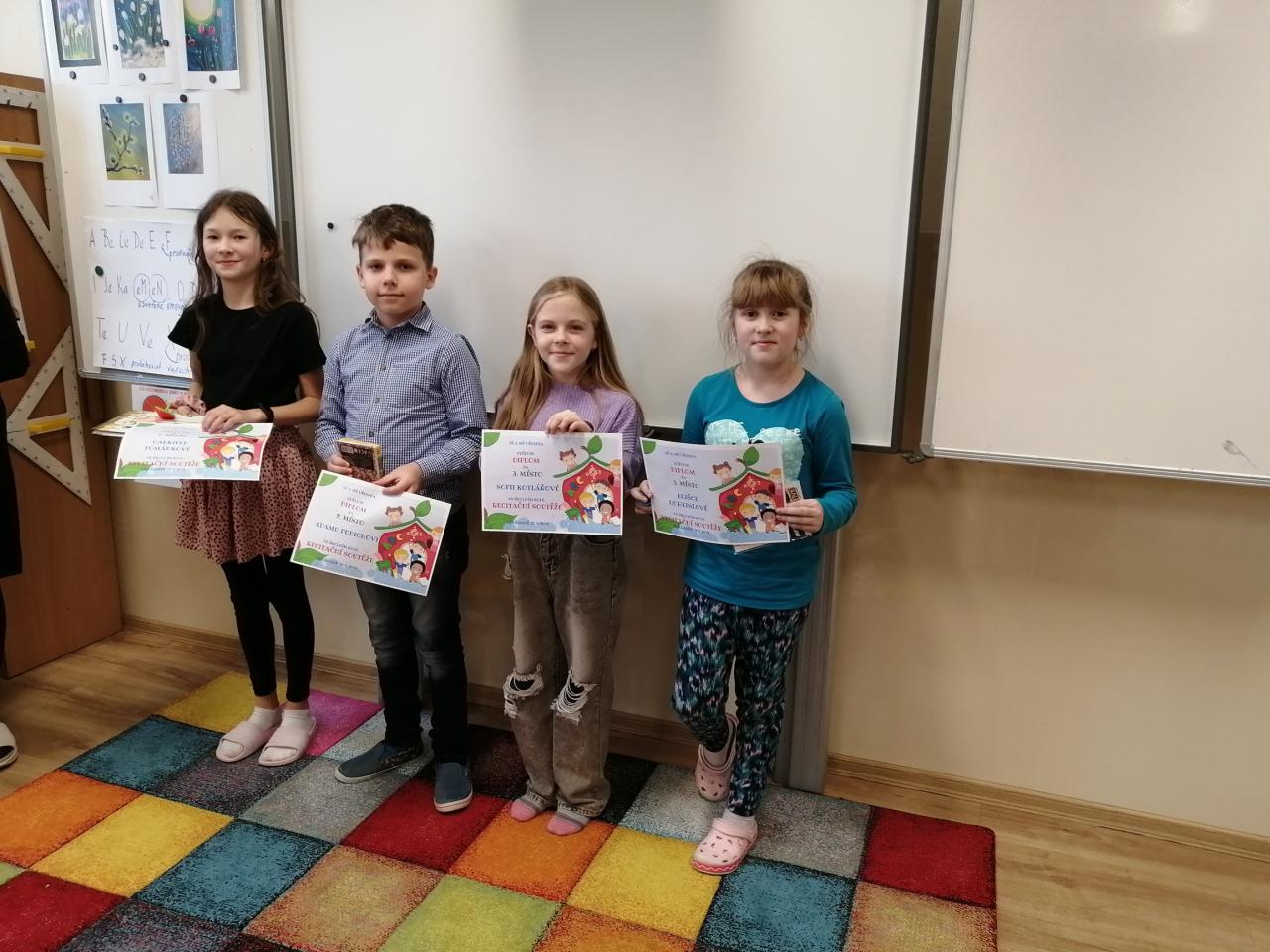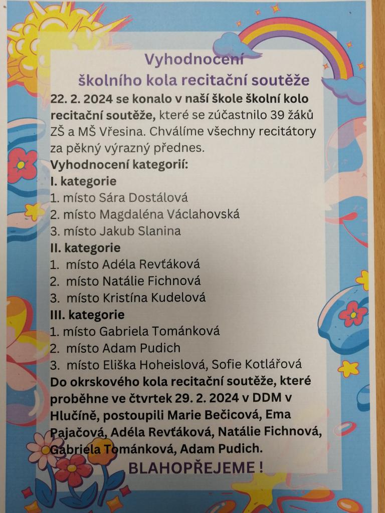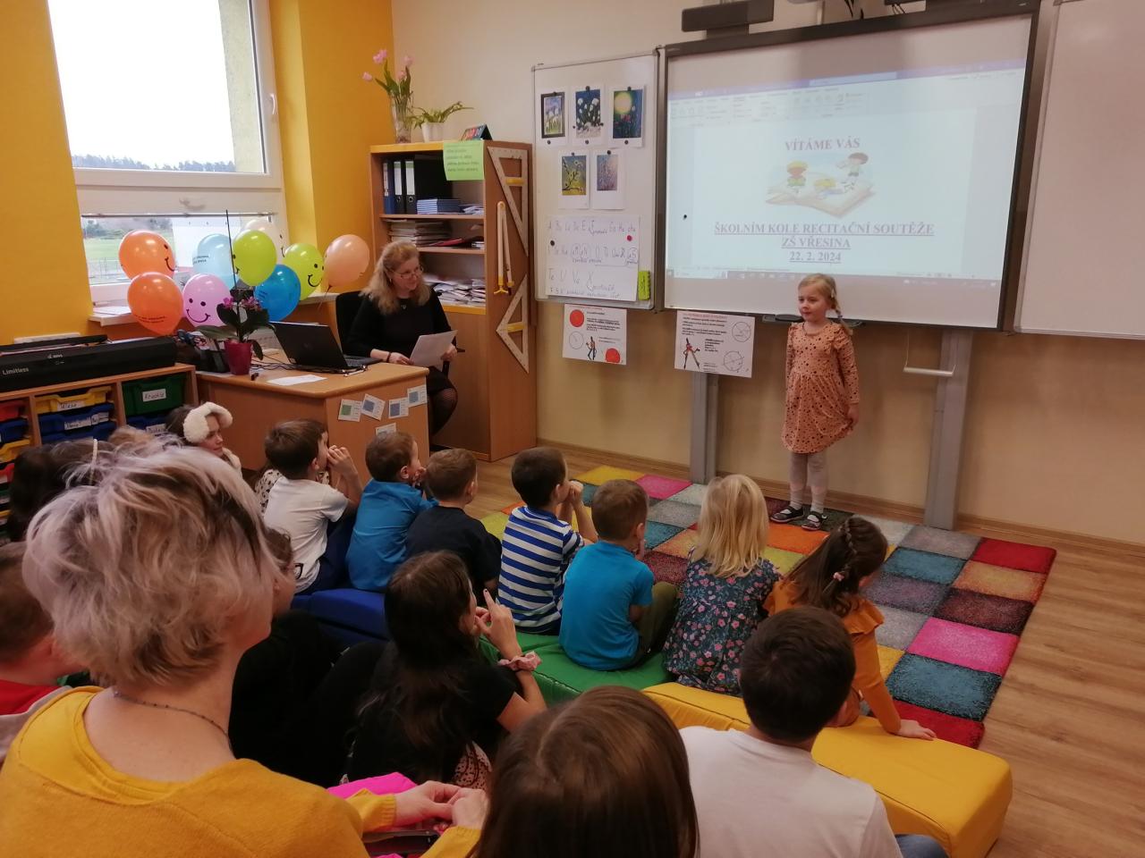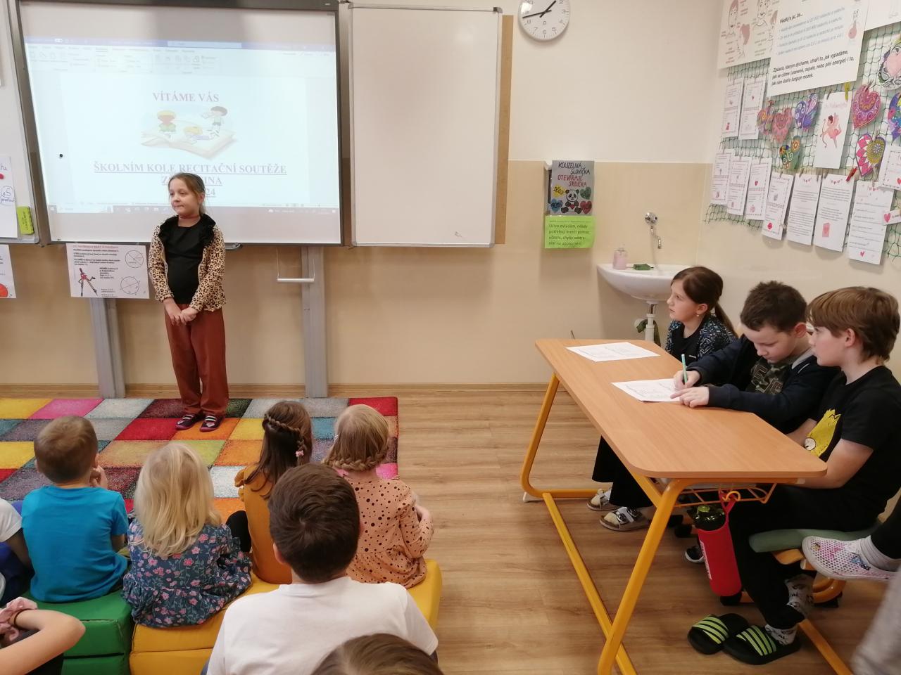 Ve čtvrtek 22. 2. 2024 proběhlo školní kolo recitační soutěže, které se zúčastnilo 39 recitátorů z MŠ i ZŠ. Všechny přednesy byly moc krásné a porota to neměla vůbec jednoduché vybrat ty nejlepší. Všem gratulujeme a děkujeme za krásné odpoledne plné poezie.