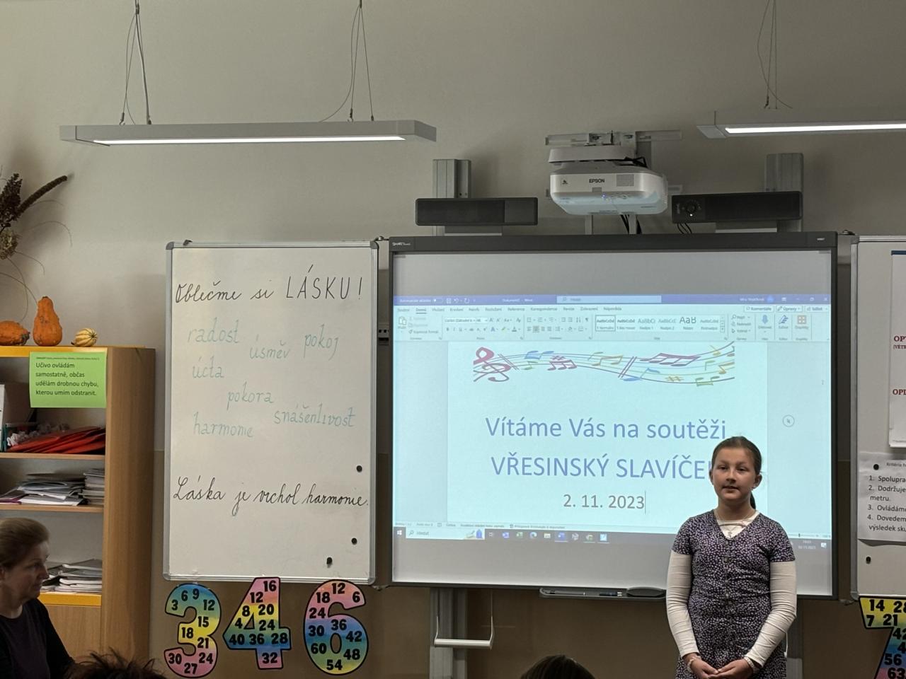 Ve středu 2. listopadu se konalo v budově ZŠ školní kolo Vřesinského slavíčka. Všechny děti se snažily, užili jsme si jejich pěvecké výkony. Některým se dařilo skvěle, jiné mírně potrápila tréma. Nikdo z nich to ale nevzdal, a proto si zaslouží veliké ocenění úplně všichni.