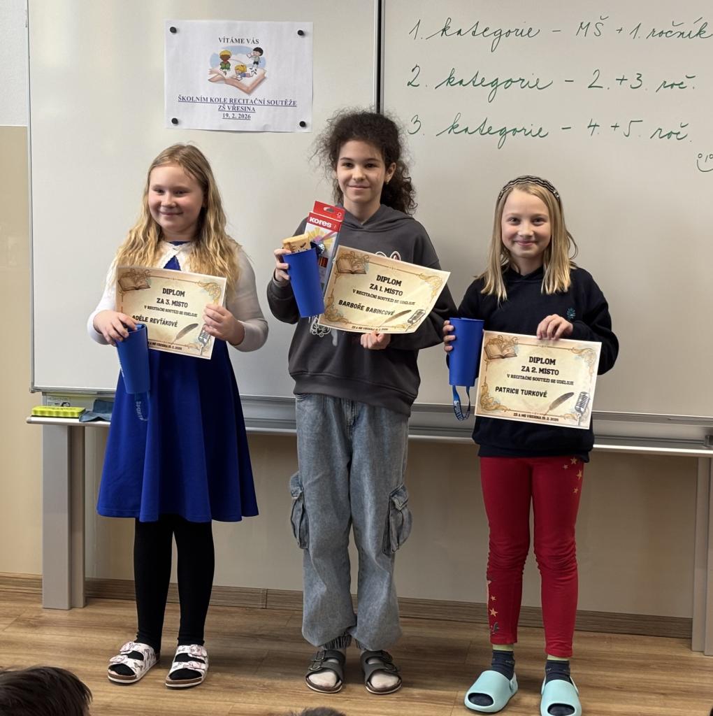 Část našeho školního odpoledne zaplnily děti svou recitací. Účast byla hojná, přivítali jsme u nás i odvážné předškoláky! Potěšila nás také přítomnost řady rodičů, čímž jim upřímně děkujeme za podporu dětí! Všichni jsme si to užili a postupujícím budeme přát úspěch v navazujícím okrskovém kole...